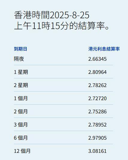 智通财经APP获悉,8月25日,港元拆息普遍下跌,而与楼按相关的一个月拆息连跌3日,报2.7272%,跌4.34基点,是8月19日后最低;反映银行资金成本的三个月拆息报2.78952%,跌4.786基点。